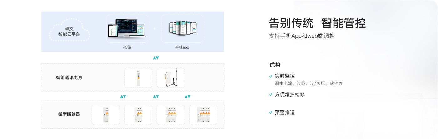 (3)独有的智能断路云控电技术∶产品内置可靠性更强的断路器控电装置和智能性更强的数字化控制芯片,真正意义上实现智能断路控电功能,不仅可精准、快速地实现用电云管理,而且可以实现在数字芯片关闭状态下,智能微型融合断路器依旧可以保留短路保护、漏电保护等用电保护功能。(注∶1P、3P智能微型融合断路器不带漏保功能)
